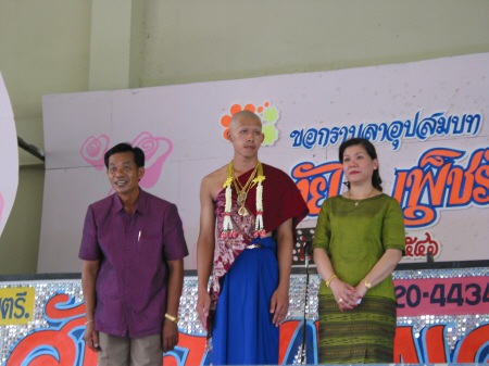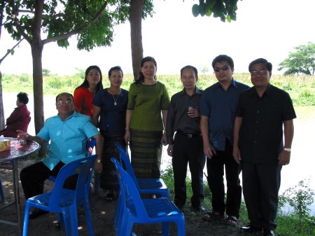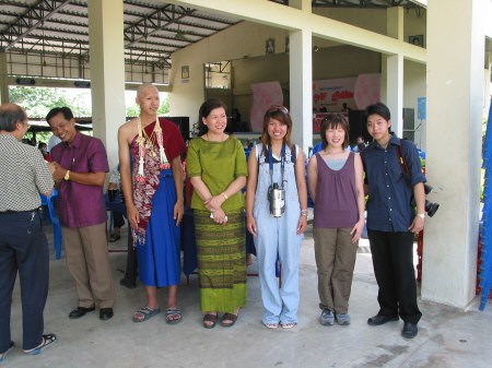 家の前に川がゆったりと 流れています。 川があるのでクルンテープより 涼しいです。 魚もたくさんいます。 到着後。親族+ジャックと。 あまりにも来賓が多い為、 体育館でお迎え。 3時間ほど食べたり、 食べたり飲んだりする 舞台で挨拶。
