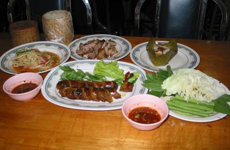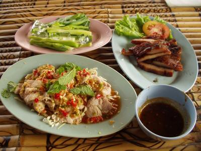 バンコクのイサーン料理屋で。 左手前は豚肉とマナーオをあえたもの。